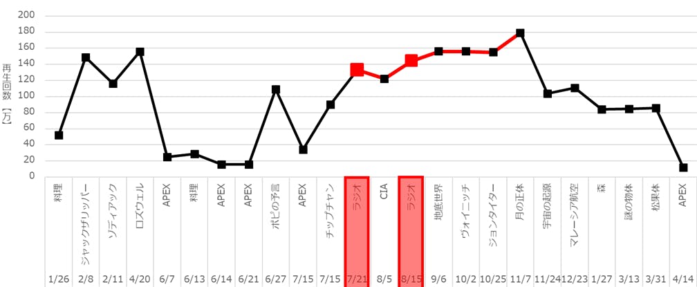 赤のマーカで強調されている項目が「ラジオ動画」の再生回数です。